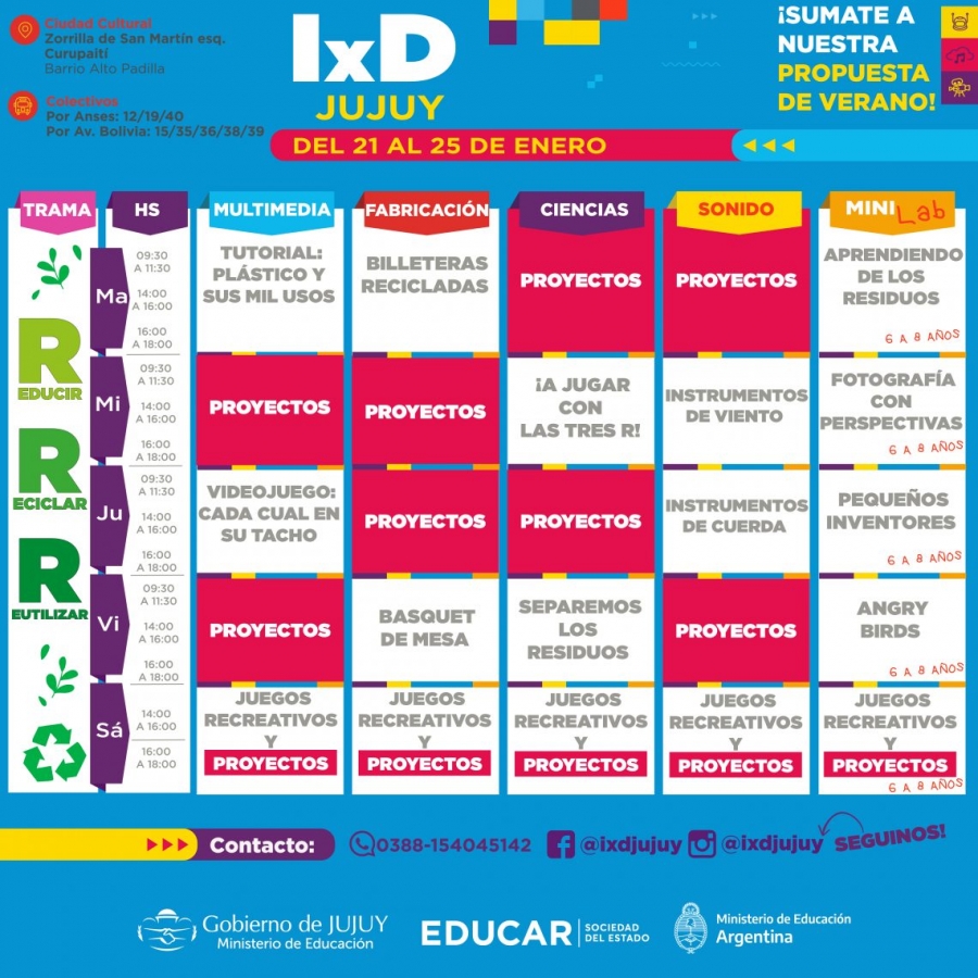 La Propuesta de Vacaciones de Verano incluyen actividades relacionadas a las “Tramas” (con diferentes ejes temáticos), Experimentos, Triple R (Reducir, Reciclar, Reutilizar), Cine, Robótica, Videojuegos, Arte Sonoro y Carnaval. Las mismas se propondrán desde nuestros laboratorios de Ciencias, Sonido, Fabricación Digital y Multimedia, durante las semanas de enero y febrero.