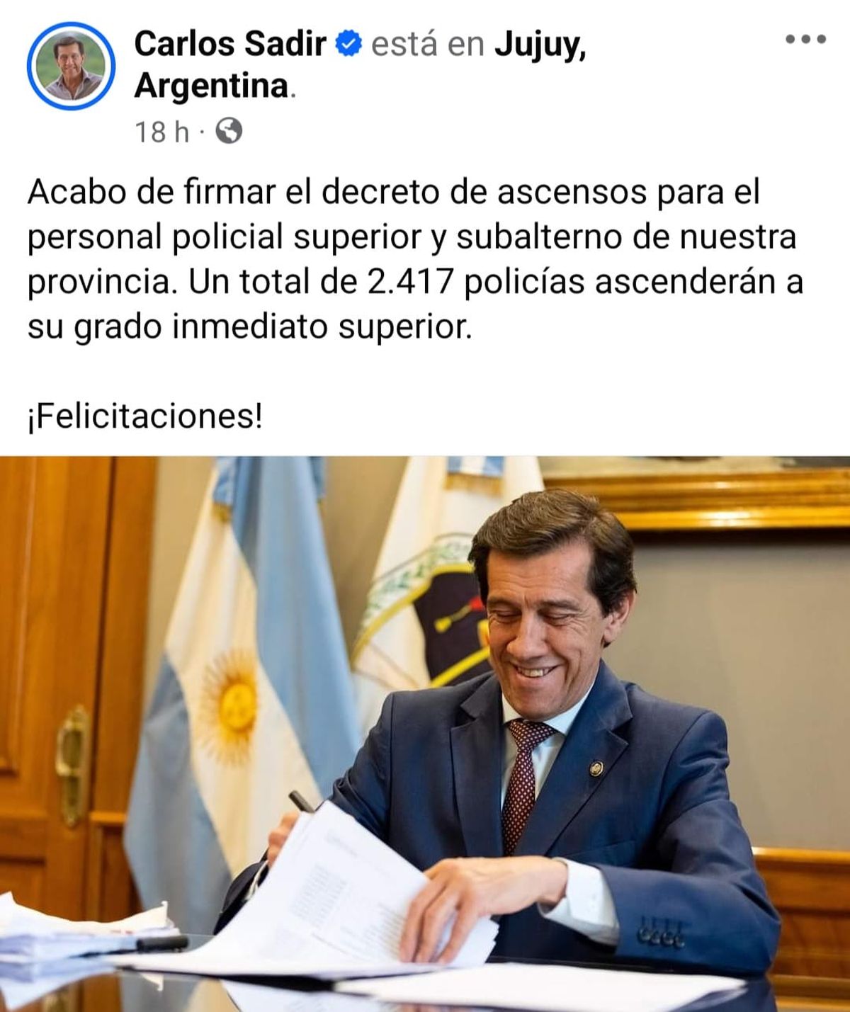 Carlos Sadir felicitó a los policías promocionados, que de acuerdo al mérito y a la legislación vigente les corresponde el ascenso. “Más de 2400 policías se van a ver beneficiados, a ellos les quiero mandar un fuerte abrazo”, expresó.