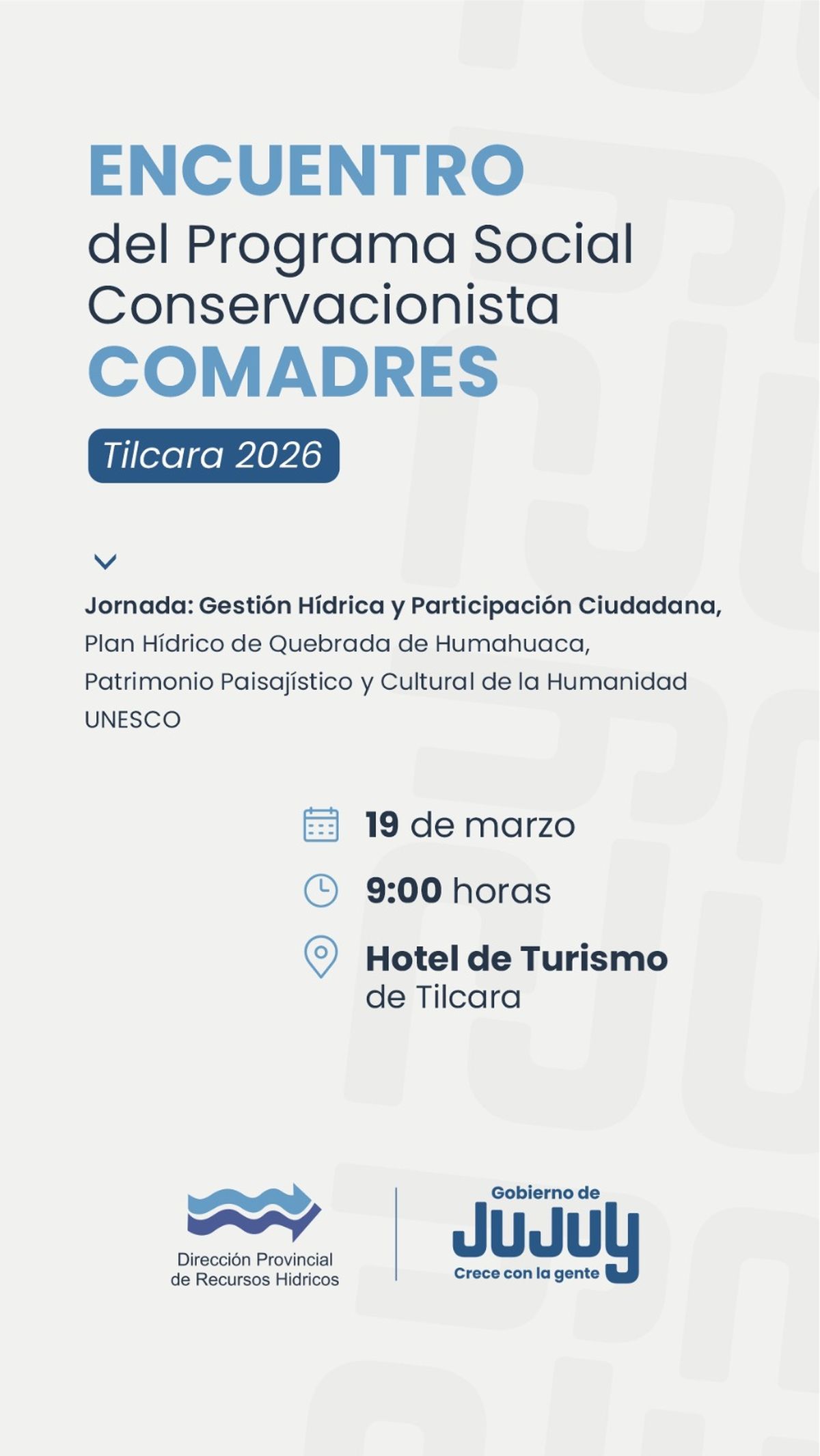 La jornada propuesta para el Encuentro del Programa Comadres lleva el nombre “Gestión Hídrica y Participación Ciudadana”, y se llevará a cabo el 19 de marzo desde las 9.00hs en el Salón de Conferencias del Hotel de Turismo de Tilcara, contando con la participación de funcionarios provinciales, locales, especialistas en gestión de cuencas hídricas, representantes de familias y comunidades con experiencias técnicas comunitarias de quebrada y puna, y referentes del tema.