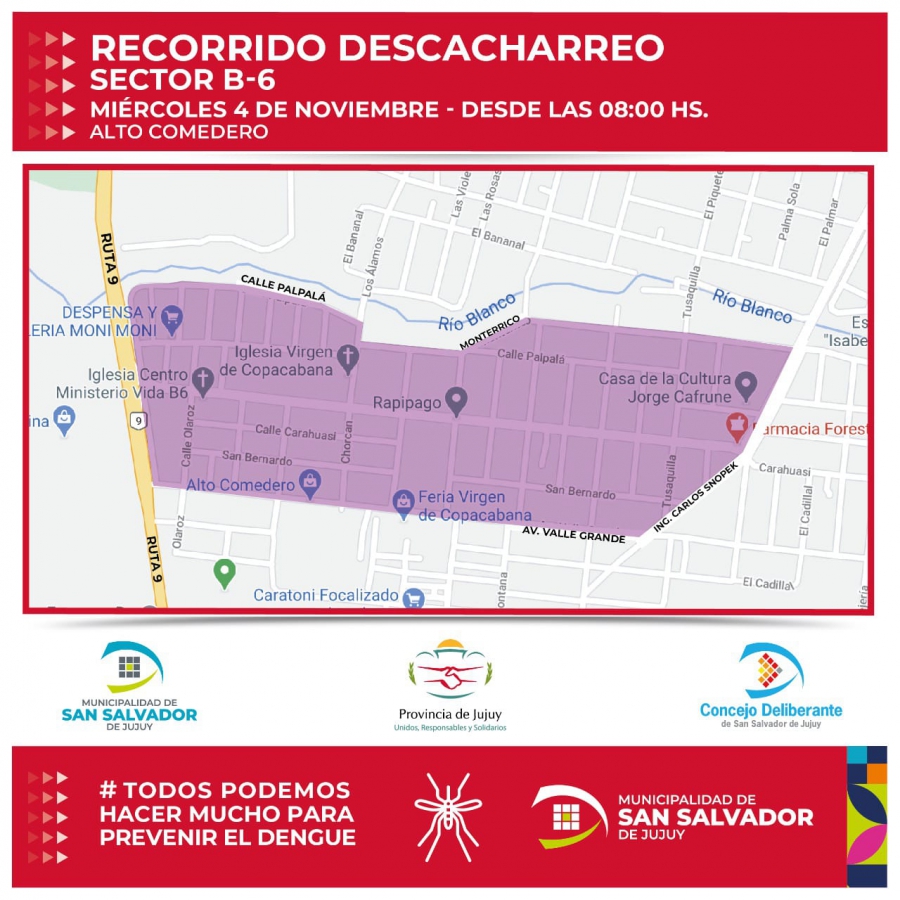 Al brindar detalles del accionar, el titular de la Delegación Municipal de Alto Comedero, Marcelo Jorge, manifestó que los camiones comenzarán el recorrido desde las 8:00 horas del miércoles en diversas arterías del Sector B 6; razón por la cual se concretó previamente una campaña de concientización puerta a puerta, notificando a los vecinos que se despojen de todo elemento que sea cisterna del mosquito para hacer efectiva la tarea.