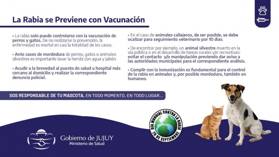 El Ministerio de Salud de Jujuy, a través del Departamento Provincial de Zoonosis, informó que el marco del Día Mundial frente a la rabia que se conmemora cada 28 de septiembre, desde este lunes se realizará en Jujuy la semana intensiva de trabajo incluyendo dos acciones esenciales: por un lado, la vacunación masiva de mascotas en centros veterinarios de San Salvador de Jujuy, Yala, San Antonio, Volcán, Palpalá, Perico, San Pedro, Libertador y Yuto y por otro, la sensibilización respecto a la tenencia responsable.