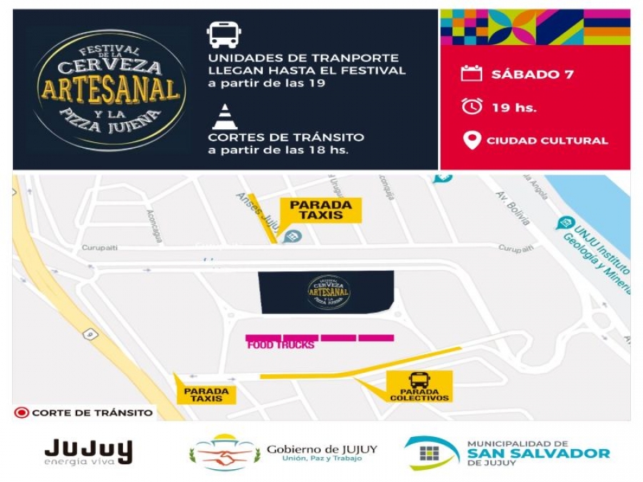 La secretaría de Servicios Públicos de la Municipalidad de San Salvador de Jujuy, a través de la dirección de Tránsito y Transporte, comunicó a los usuarios del transporte urbano de pasajeros, que en razón de llevarse a cabo el sábado 07 el IV Festival de la Cerveza Artesanal y la Pizza Jujeña en Ciudad Cultural, se ha dispuesto que las líneas del transporte urbano de pasajeros afecten su recorrido llegando hasta el lugar del evento donde se fijarán paradas debidamente identificadas para cada línea. Asimismo se informó que estas modificaciones se realizarán a partir de las 19hs. hasta la finalización del evento.