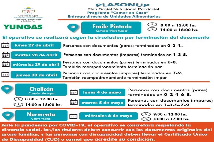 Mientras que en Fraile Pintado, tendrá lugar los días lunes 27, martes 28, miércoles 29 y jueves 30 de abril, en el comedor “Nora Mealla”, en el horario de la mañana de 8:00 a 12:00 y por la tarde de 14:00 a 18:00 horas, de acuerdo al esquema de circulación de personas, según la terminación del documento (número par e impar), distribuidas de la siguiente manera: