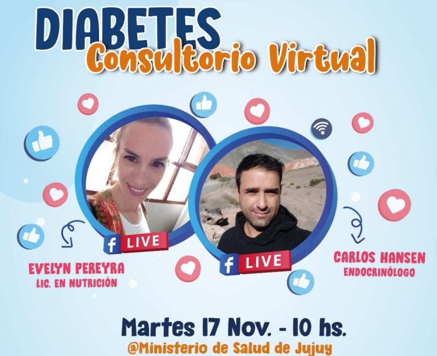 Entre las actividades programadas por el Mes de la Diabetes, se invita este martes 17 de noviembre desde las 10 horas en el Facebook del Ministerio de Salud de Jujuy, al Consultorio Virtual con la Lic. Evelyn Pereyra y el Médico Endocrinólogo, Carlos Hansen. Ambos, responderán preguntas de la comunidad que ya pueden dejarse en la red social.