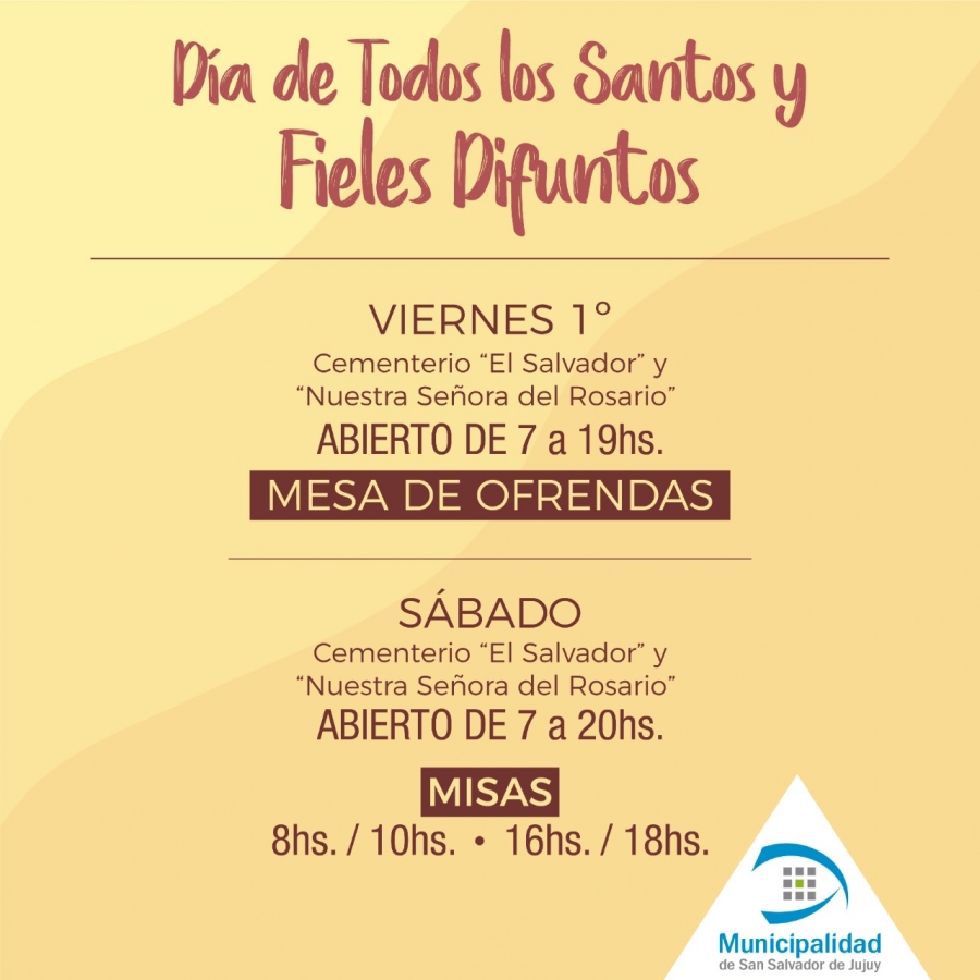 El viernes 1ro de noviembre inicia la solemnidad cristiana y desde la administración de Cementerios, dependiente de la secretaría de Servicios Públicos de la Municipalidad de la Capital, se informó que abrirán sus puertas de 7 a 19 hs. para visitar a los fieles difuntos. Mientras que en horas del mediodía, personal municipal pondrá la mesa con ofrendas que será bendecida en la misa del 2 de noviembre para que los vecinos degusten de las ofrendas a medida que visitan a sus seres queridos. También resaltaron que el viernes 1ero la administración atenderá de 7 a 19hs. para aquellos interesados en regularizar el pago.