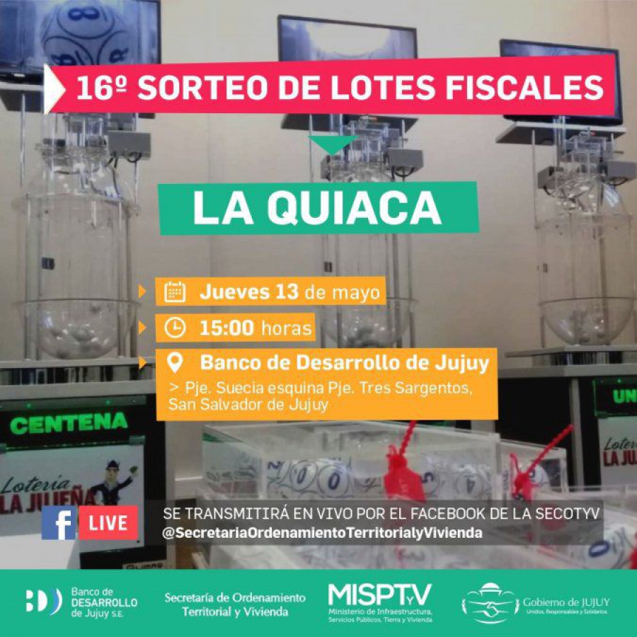 El 16º sorteo de lotes fiscales será este jueves 13 de mayo a las 15:00 horas, en el Banco de Desarrollo de Jujuy, y será transmitido en vivo a través de la cuenta oficial de Facebook de la SECOTyV. Los lotes fiscales a sortearse el jueves contarán con servicios básicos, para los que las obras están en ejecución: red de agua potable, red de energía eléctrica, calles abiertas y perfiladas, y amojonado y estaqueo de lotes.
