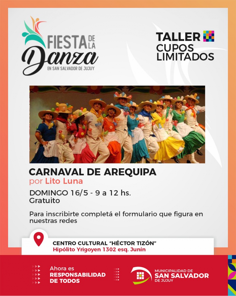 El domingo 16, también en el Centro Cultural "Héctor Tizón", por la mañana de 9 a 12 hs., el taller Carnaval de Arequipa dirigido por Lito Luna, será gratuito y las inscripciones se realizan a través del link: https://forms.gle/Ws2HZjRYXhuhWV3D9 . Cambiando la locación, en el Cine Teatro Municipal "Select" (Alvear 665, barrio Centro), habrá Tango Escenario a cargo de José García y Rosana Martínez, el requisito para este taller es que las parejas que asistan deberán tener experiencia previa en el mundo del tango, una actividad gratuita y los interesados en ser parte lo pueden hacer llenando el formulario: https://forms.gle/8vnX2EK4xQCPxqux6 .