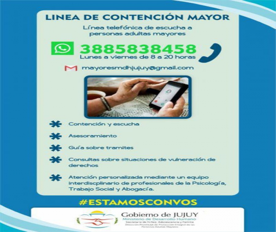 Vale recordar que la Línea telefónica de Contención Mayor 3885838458, es un un número telefónico gratuito de escucha a las personas adultas mayores que atiende de lunes a viernes de 8 a 20 horas brindando guía, asesoramiento, contención y atención a través de un equipo interdisciplinario de profesionales de la Dirección Provincial de Protección Integral de las Personas Adultas Mayores para consulta sobre situaciones de vulneración de sus derechos.