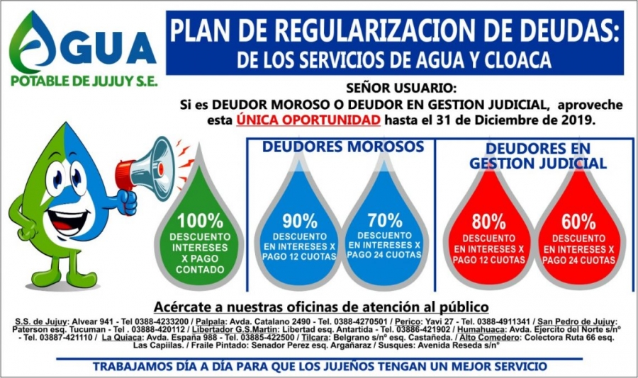 En el caso de deudores en gestión Judicial, se descontará el 80 por cientos de los intereses cuando el pago sea en 12 cuotas y un 60 por ciento de descuento para los casos del pago en 24 cuotas. Para más información los interesados podrán apersonarse en todas las oficinas habilitadas de Agua Potable de Jujuy.