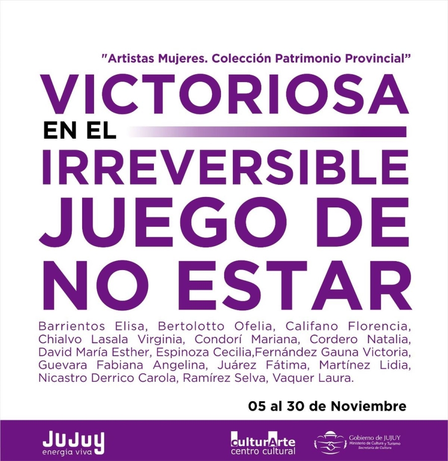 El Ministerio de Cultura y Turismo a través de la Secretaria de Cultura invita a participar de la muestra colectiva “Victoriosa en el irreversible juego de no estar” que se inaugura hoy a las 20 horas en el centro cultural Culturarte, con cupos limitados por protocolo. La exposición podrá ser visitada hasta el 30 del presente mes.