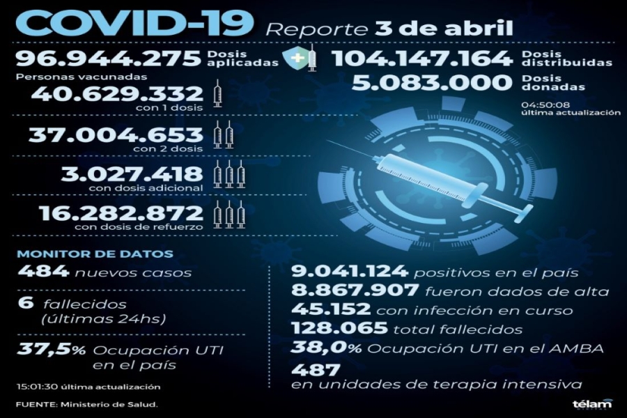 Otras 6 personas murieron y 484 fueron reportadas con coronavirus en las últimas 24 horas en la Argentina, con lo que suman 128.065 los fallecidos registrados oficialmente a nivel nacional y 9.041.124 los contagiados desde el inicio de la pandemia, informó este domingo el Ministerio de Salud.