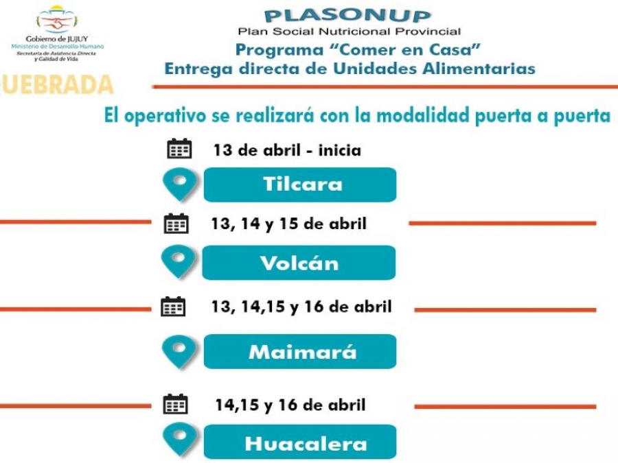 - -Huacalera, se concretará los días martes 14, miércoles 15 y jueves 16 de abril, con la modalidad puerta a puerta.