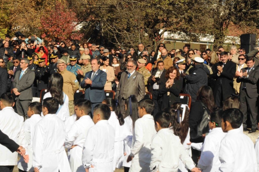 Cumplidos los protocolos de rigor, el intendente Jorge se trasladó al Polideportivo del RIM 20, junto al resto de las autoridades que acompañaron al vicegobernador Alberto Bernis, a presenciar el acto solemne de Juramento a la Bandera que año a año prestan los niños de cuarto grado de distintos los establecimientos escolares, junto a los cadetes del Instituto Universitario Provincial de Seguridad y los soldados voluntarios que prestan servicio militar.