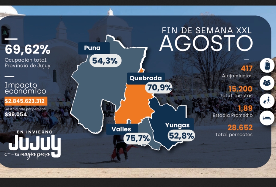Los resultados del fin de semana largo de agosto consolidan la tendencia positiva del sector turístico jujeño y auguran un buen cierre de la temporada invernal, con perspectivas favorables de cara a los próximos feriados y la temporada alta de verano.
