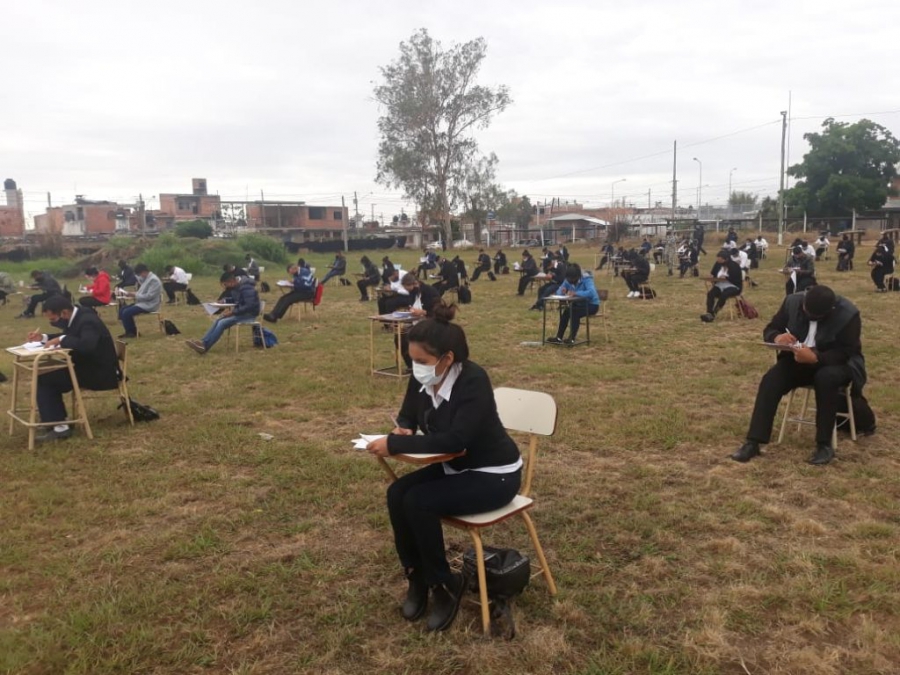 Los alumnos rinden por turno, en fila, respetando el distanciamiento social, preventivo y obligatorio, y evitando aglomeraciones.