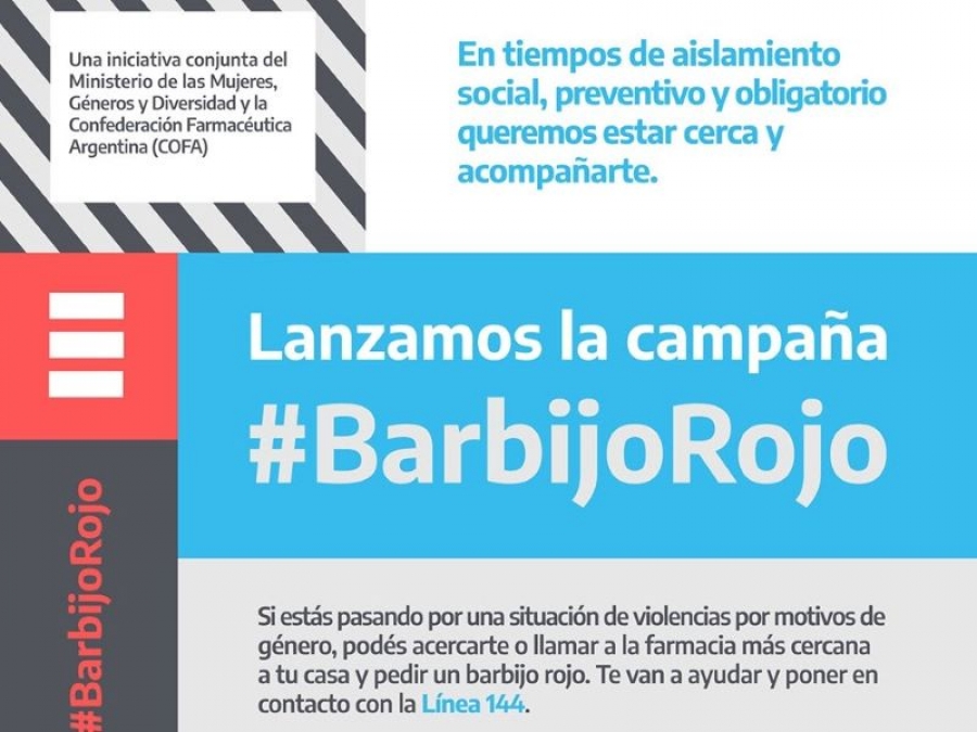 En este marco, las mujeres y personas LGBTI+ podrán acercarse a la farmacia más cercana de su barrio o llamar a la de confianza y solicitar un #BarbijoRojo, para que el personal comprenda que se trata de una situación de violencia por motivos de género y gestione una comunicación con la Línea 144, único dispositivo federal de asesoramiento y asistencia integral ante situaciones de violencia por motivos de género en todo el país.