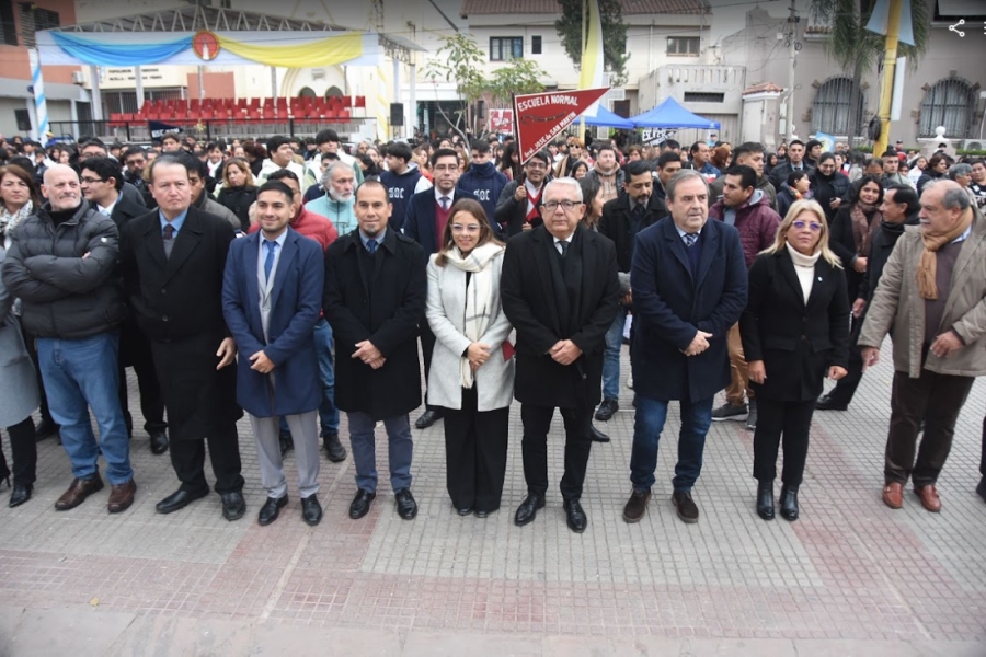Las actividades programadas se iniciaron en plaza Manuel Belgrano, con el izamiento de la Bandera Nacional y la Bandera Papal, encabezado por el vicegobernador Alberto Bernis, el intendente Julio Bravo, la legisladora provincial Gisel Bravo acompañados por estudiantes, autoridades provinciales, municipales y fuerzas de seguridad.