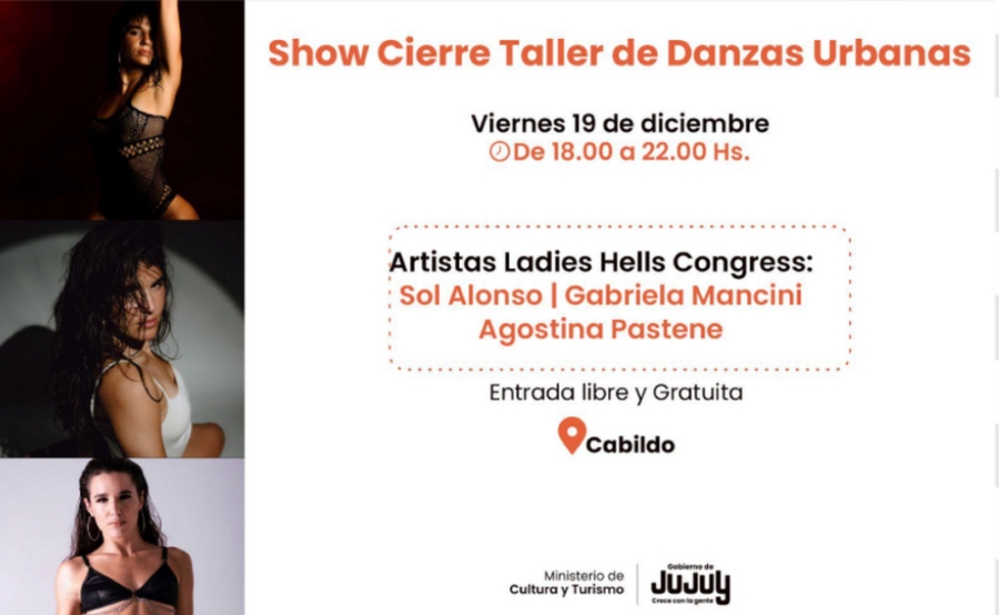Sol Alonso, Gabriela Mancini y Agostina Pastene, integrantes del Ladies Hells Congress, presentarán un show que cierra el ciclo del taller con una experiencia de cuatro horas donde la danza urbana se despliega en toda su intensidad. La propuesta es una manifestación de lo aprendido, practicado y sentido en el espacio de formación, transformando el taller en acción escénica que invita a la comunidad a presenciar la evolución de quienes descubrieron en las danzas urbanas una forma de expresión y libertad.