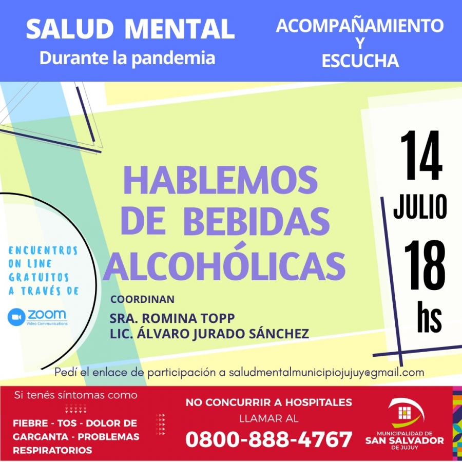 La temática "Hablemos de bebidas alcohólicas" estará a cargo de Romina Topp y el Lic. Álvaro Jurado Sánchez. Para participar de esta actividad que es vía online, se puede acceder a la plataforma Zoom enviando un correo electrónico a: Esta dirección de correo electrónico está siendo protegida contra los robots de spam. Necesita tener JavaScript habilitado para poder verlo. o bien al teléfono 3884298765. Una vez que lo soliciten, se les enviará el enlace, con los encuentros que son a partir de las 18 horas.
