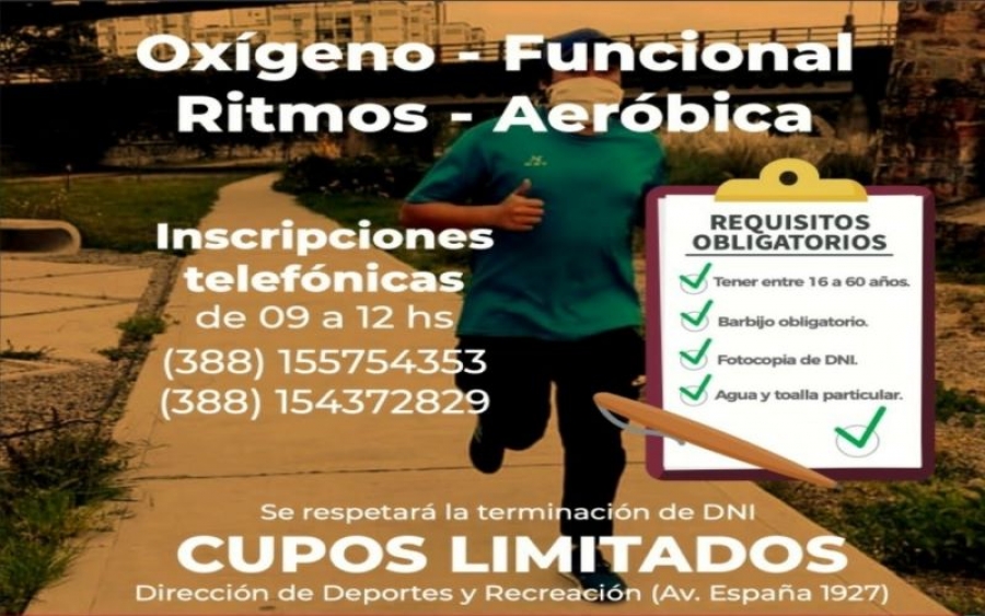 Las clases deportivas habilitadas serán dictadas, de acuerdo a las normativas del COE, en el polideportivo ubicado en la punta del Parque San Martín. Se brindarán clases de OXIGENO a las 9; FUNCIONAL a hs. 8 y por la tarde RITMOS a las 15hs.; AEROBICA 18 , respetando las normativas y el protocolo de bioseguridad y la terminación del DNI con planilla.