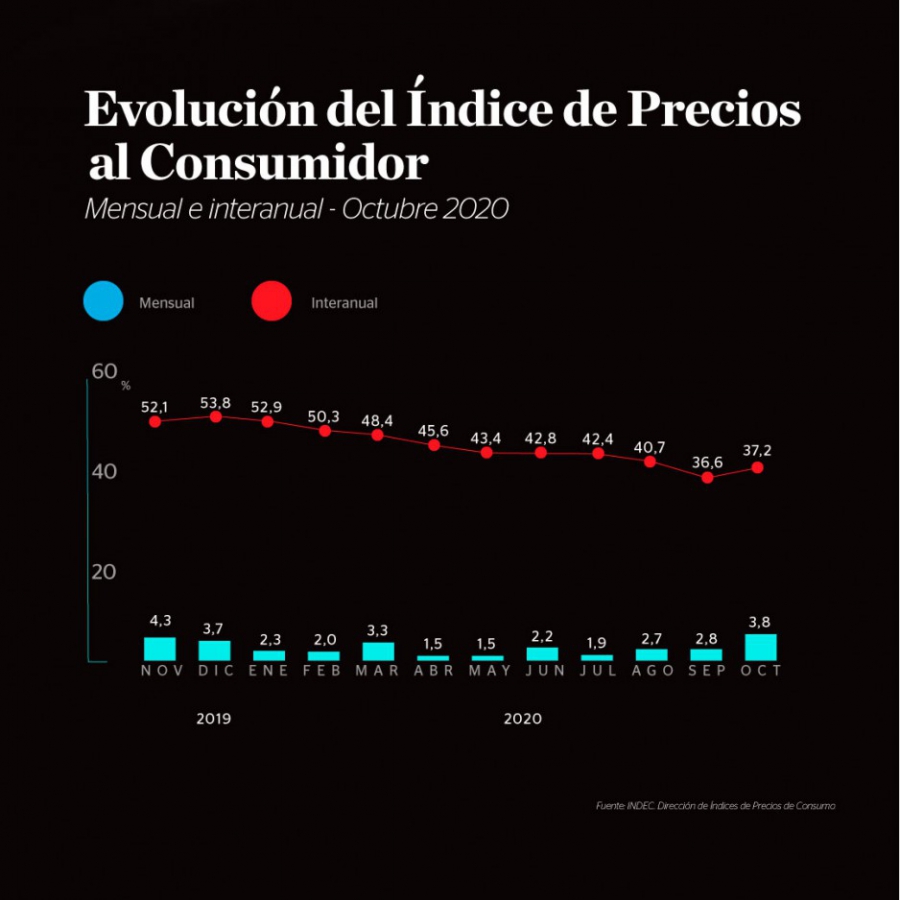 Así y todo, desde el Gobierno destacaron que, pese a la aceleración de octubre, la inflación de 2020 va a cerrar prácticamente veinte puntos por debajo de la del año pasado. En efecto, para igual mes del año pasado, la inflación interanual marcaba 50,5%, 22,3 puntos porcentuales más que el 37,2% publicado este jueves. LPO